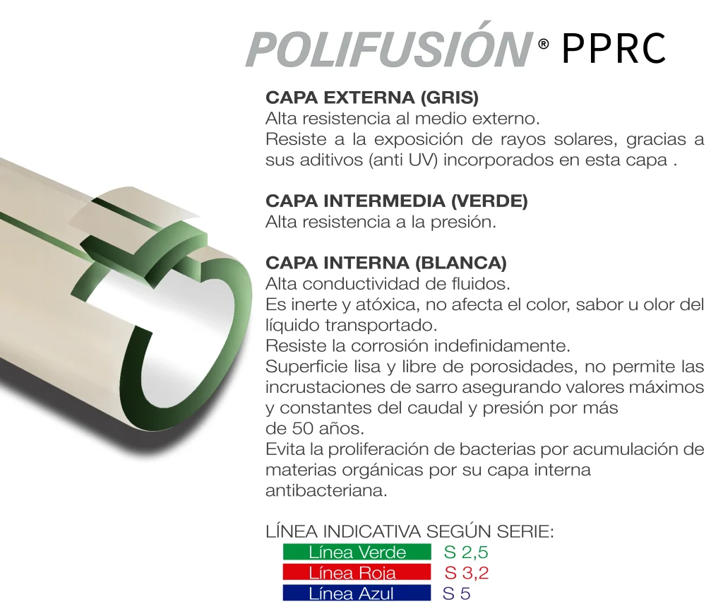 Estas tuberías fabricadas con materia prima PP-RCT, están diseñadas para aplicaciones sanitarias de agua fría y caliente con presiones de trabajo a temperatura elevadas. Ideal para instalaciones en edificios, embutidos en losas, por su menor espesor de pared es posible optimizar los diámetros instalados además posee una capa interna con protección antibacteriana.