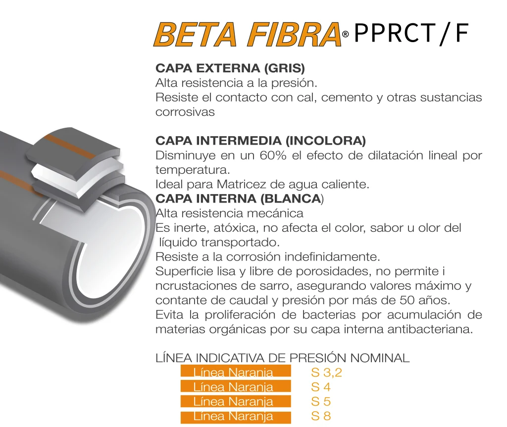 Tuberías PP-RCT Beta Nucleado con fibra y anti bacteria, Línea Naranja S-3,2, S-5, S-8
